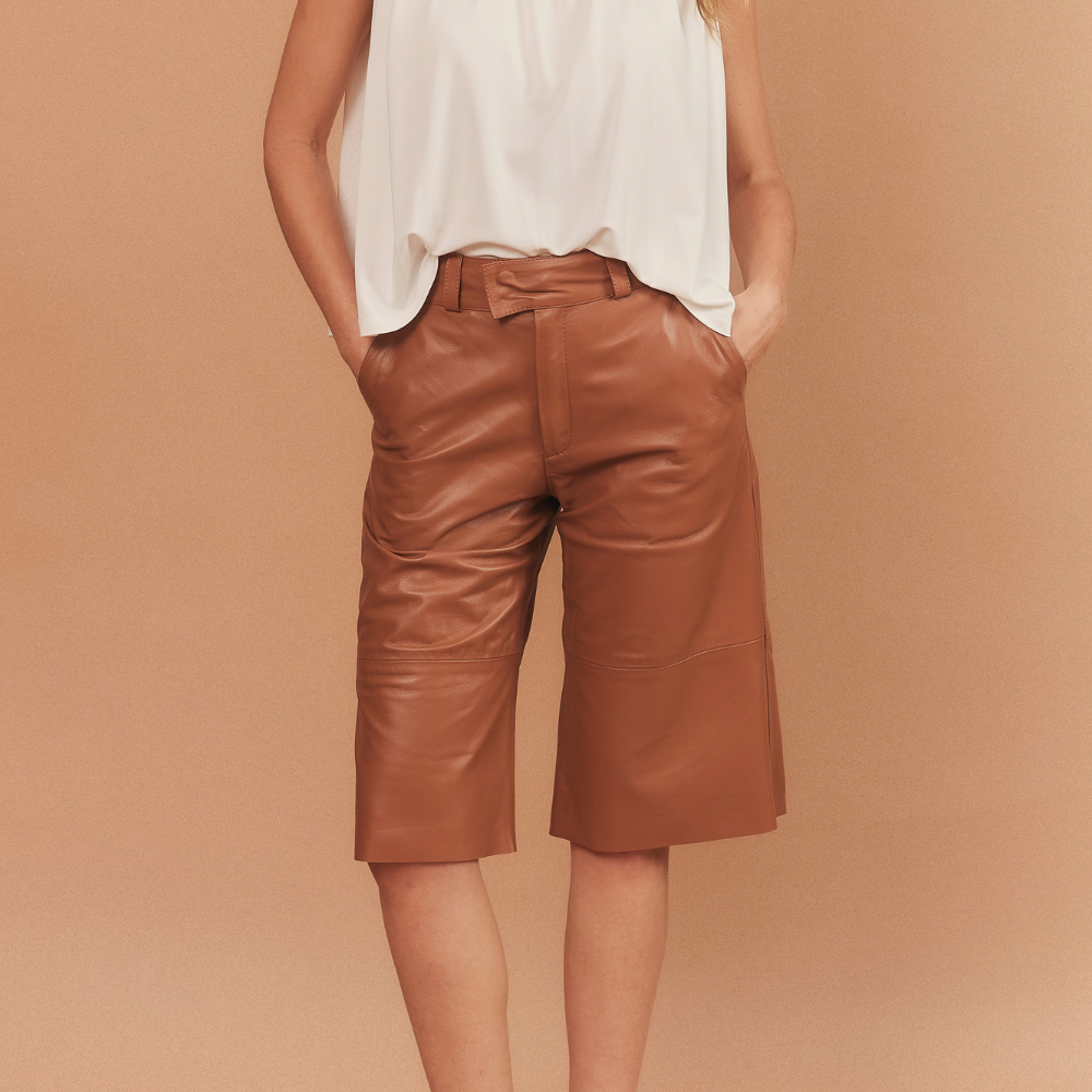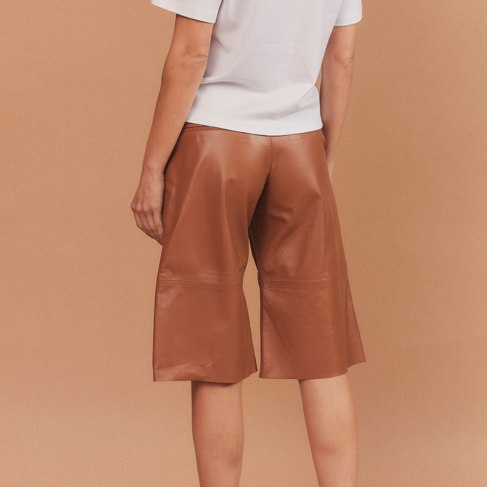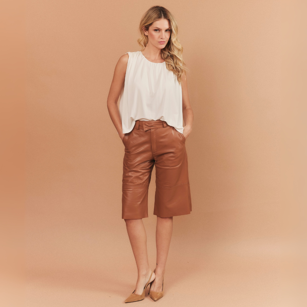 Bermuda em couro com corte reto, ideal para um visual sofisticado e contemporâneo.