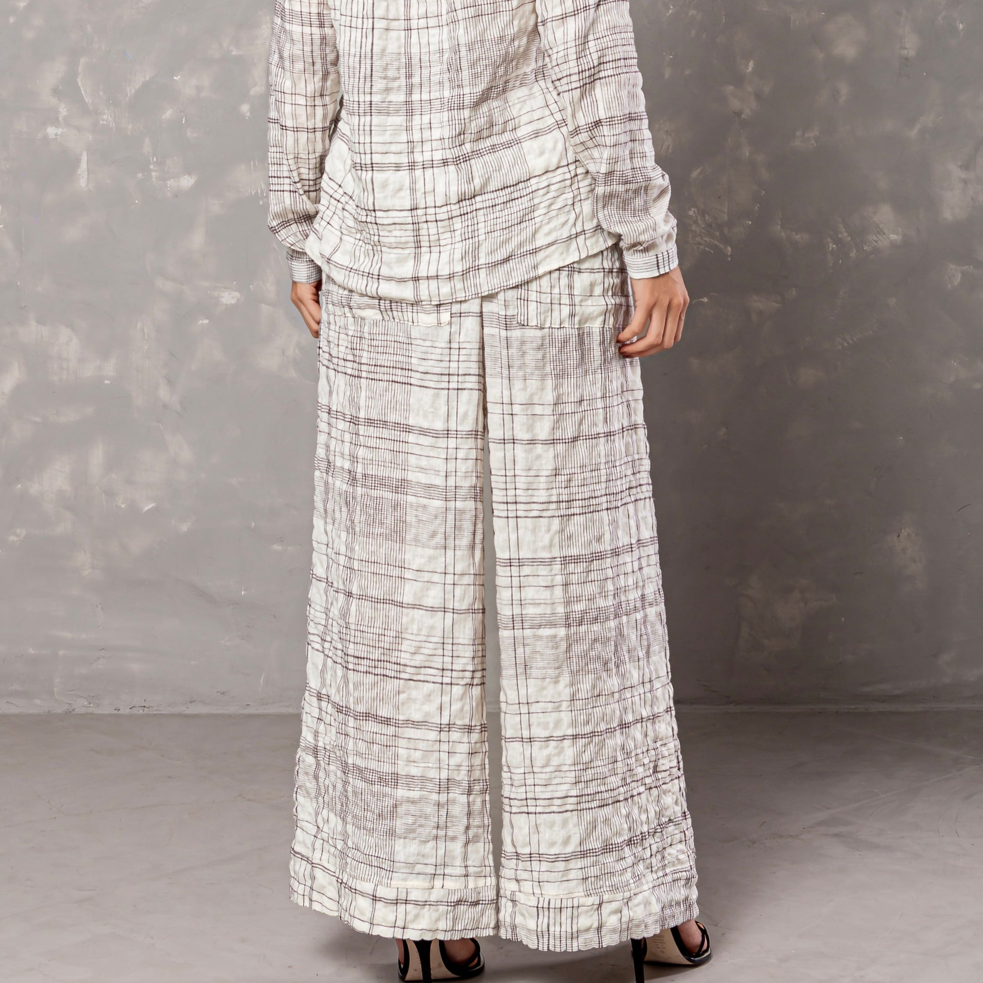 Calça com shape pantalona, feita em tecido leve e com estampa xadrez na cor off white, possui bolsos frontais lateralizados e pequenas pregas que saem de um cós mais largo. Abertura por zíper na parte traseira do cós.