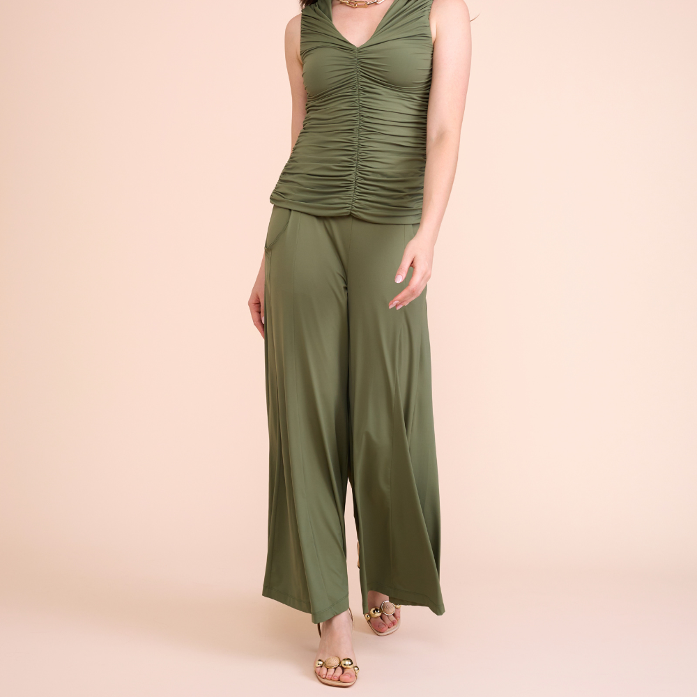 Calça pantalona com caimento fluido e modelagem ampla, que garante elegância e conforto. Ideal para looks sofisticados e modernos, do dia à noite.