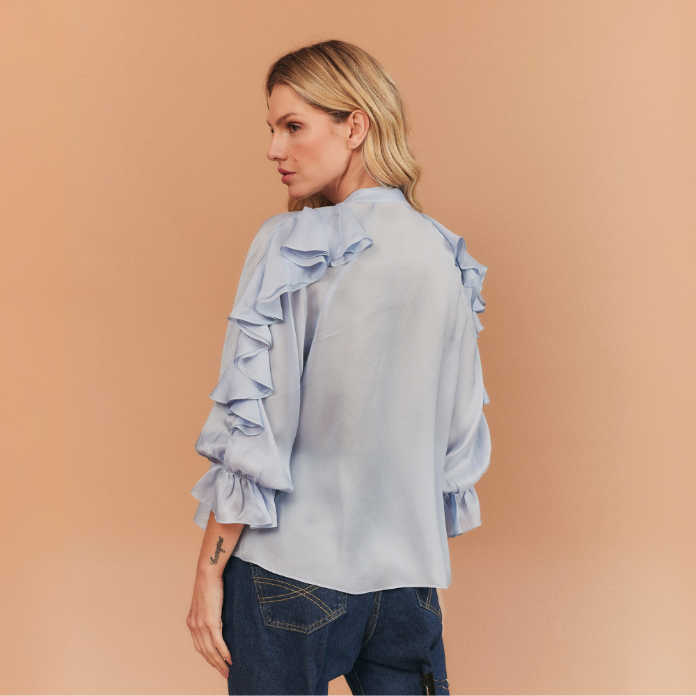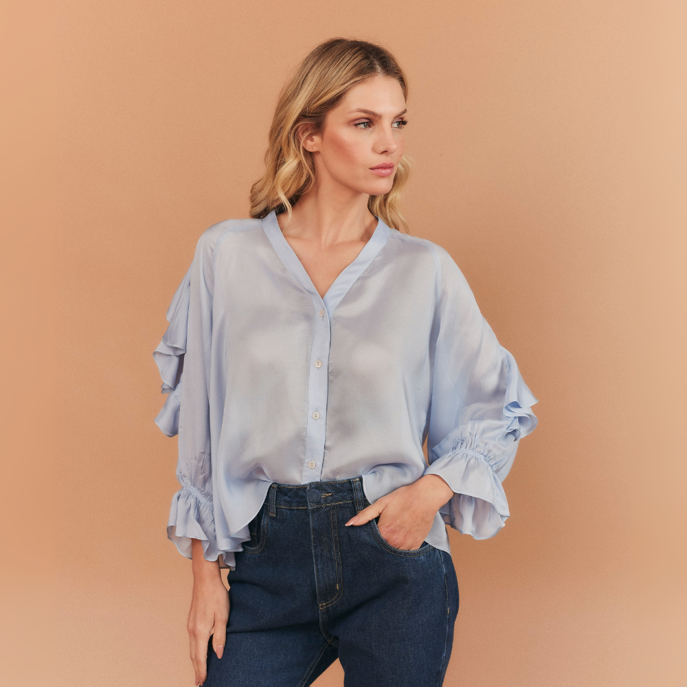 Camisa feita em georgette de viscose, sem gola, tem vista e botões na frente da peça. As mangas vem com babados em todo comprimento, finalizando com elástico e um leve babado.