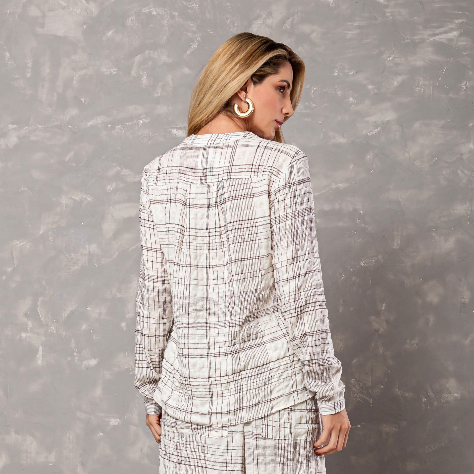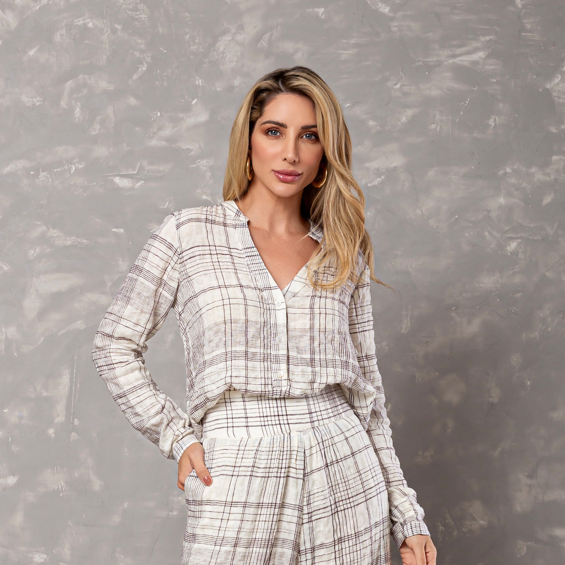 Camisa com tecido leve e estampa xadrez off white. Com devote V, abertura por botões e vista na frente. Ombro levemente assimétrico. Mangas compridas e punho na finalização.