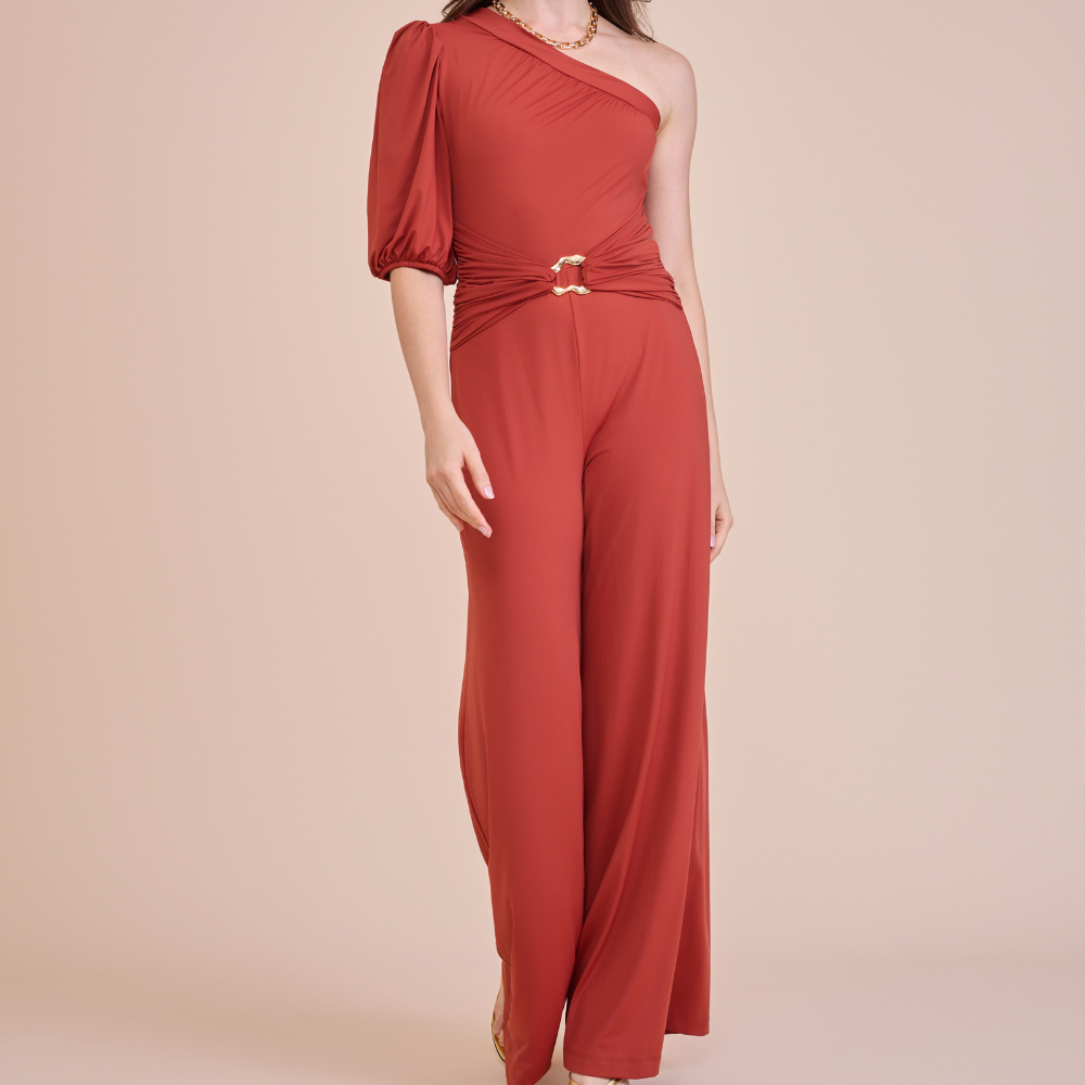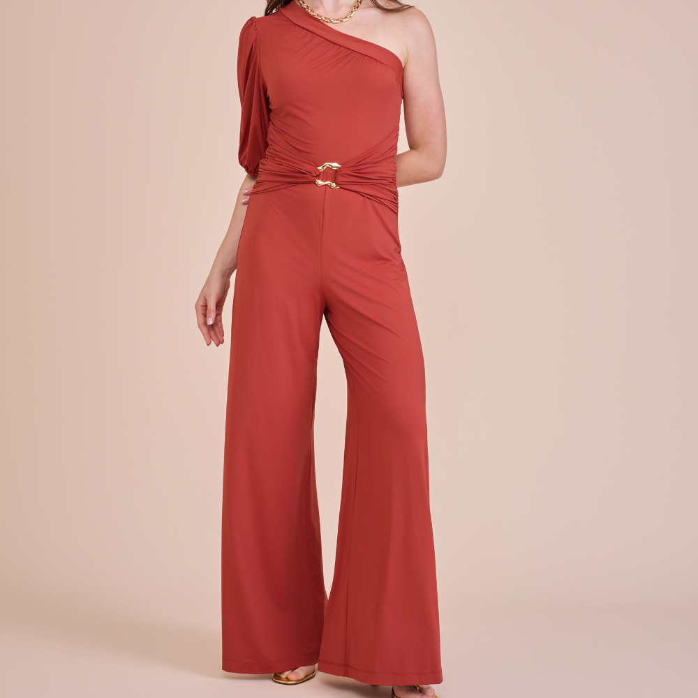 Macacão elegante em tom vermelho escuro, com design de um ombro só e manga bufante, que valoriza a silhueta. Possui detalhe drapeado na cintura com aplicação metálica, trazendo sofisticação ao look. Modelagem pantalona, fluida e confortável, ideal para ocasiões especiais ou produções mais refinadas.