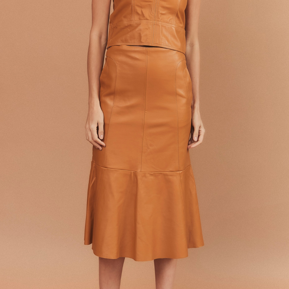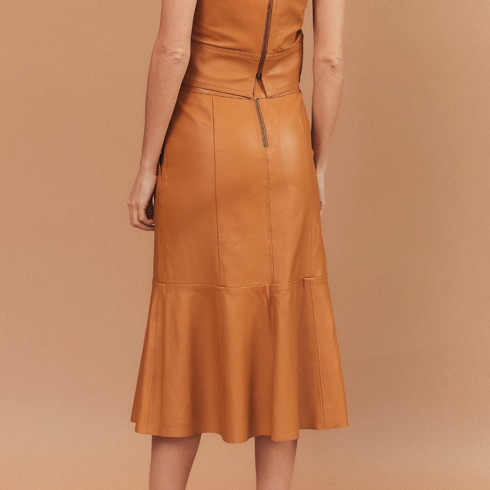 Saia no comprimento midi confeccionada em couro legítimo, shape mais alinhado ao corpo com babado saindo de recorte na altura da cintura. Recortes estratégicos, com cintura alta e zíper de metal fixo nas costas para abertura da peça.