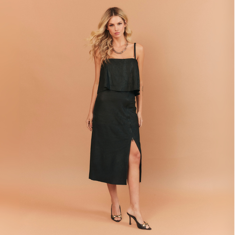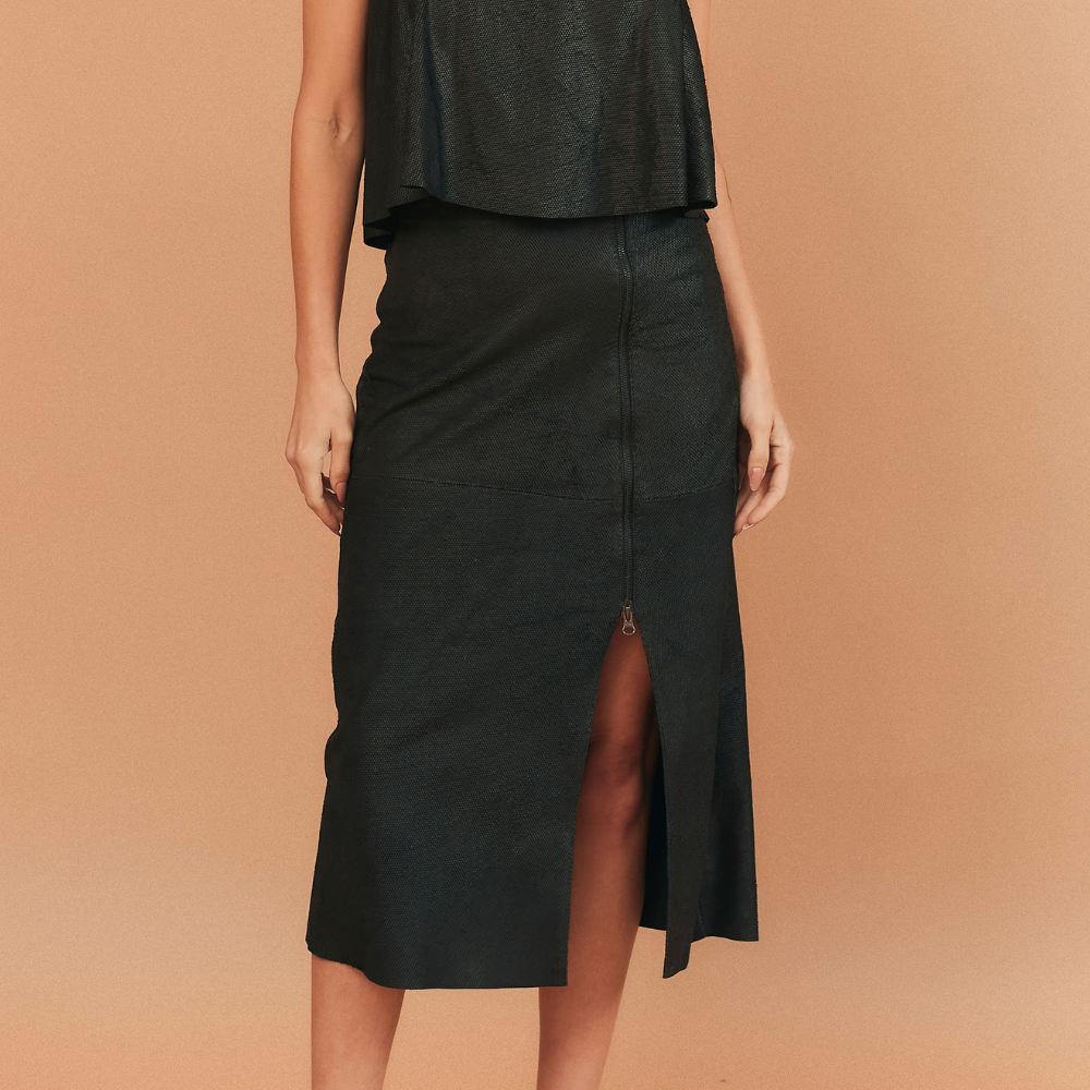 Saia midi confeccionada em couro legítimo com padronagem de serpente, vem com zíper frontal destacável, até o joelho deixando fenda até a barra. Shape reto e recortes estratégicos na peça.
