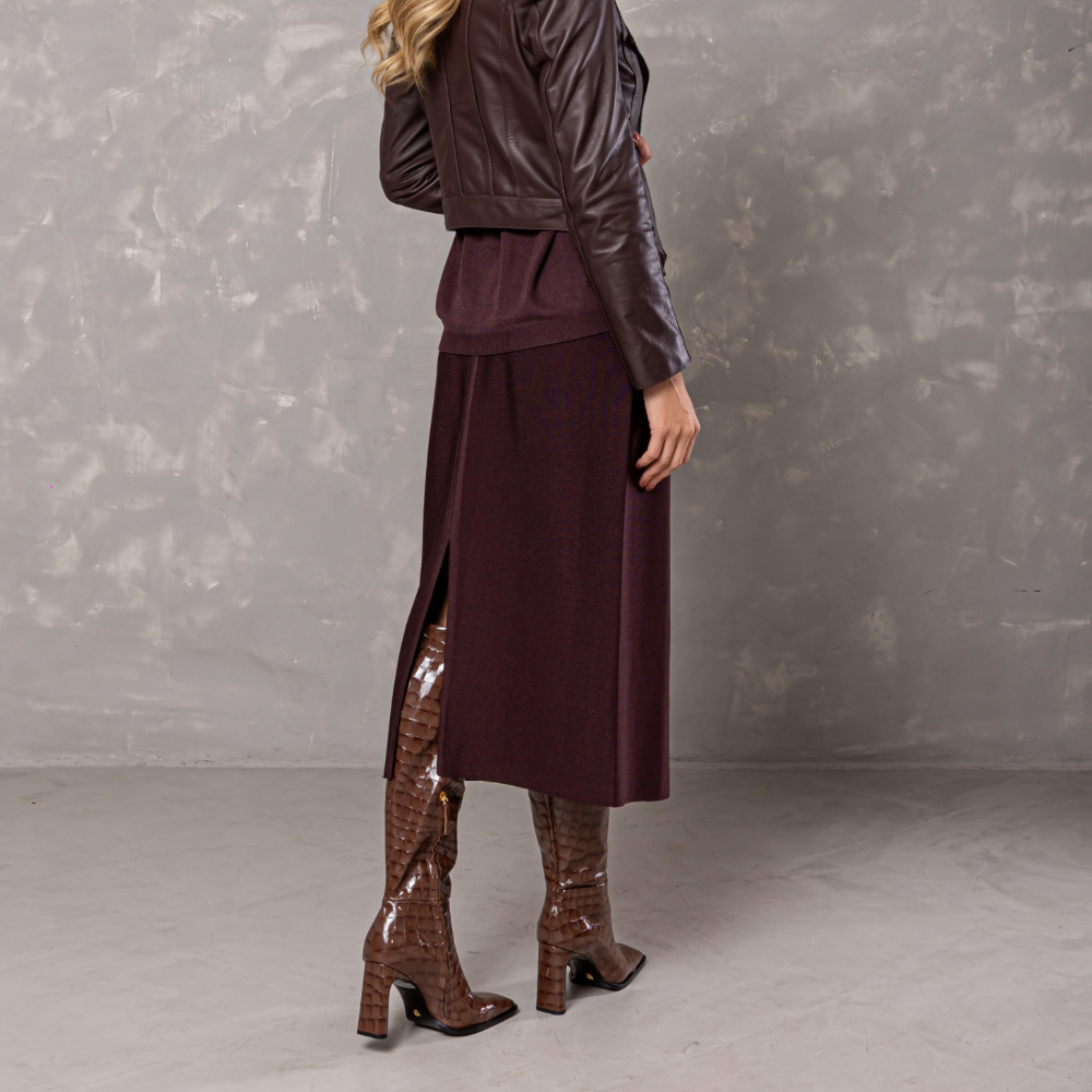 Saia longuete em tricot na cor marrom com shape reto. Lisa, com fenda no centro das costas.